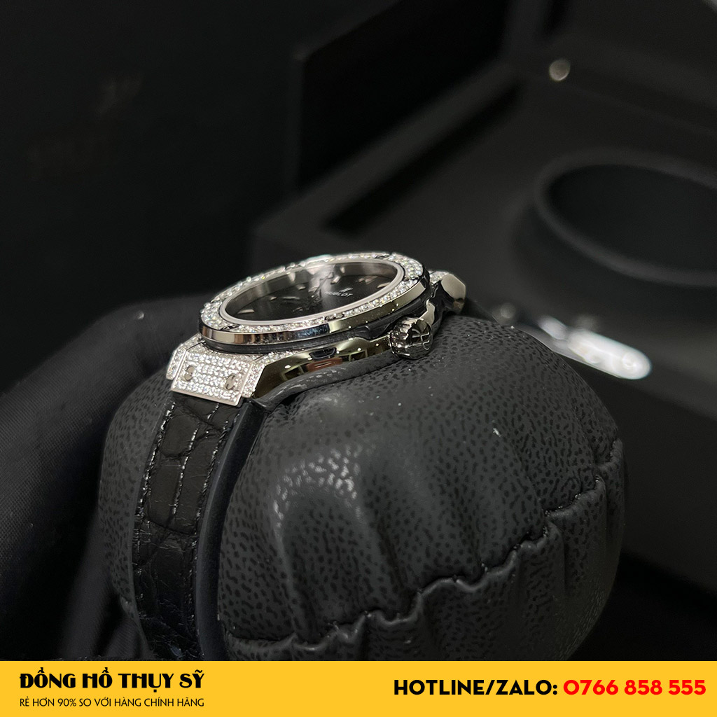 Thay vì chỉ làm từ chất liệu thép cao cấp không gỉ, phần vành bezel được các nghệ nhân tỉ mẩn đính từng viên đá kim cương san sát nhau đều đặn và hoàn hảo. Những viên kim cương nhỏ trải qua mài giũa phát ra ánh sáng lấp lánh đầy cuốn hút và mê hoặc. Dù có thiết kế khá đơn giản, nhưng chính nhờ đồng hồ Hublot like auth được đính full kim cương vành bezel nên có sức hút đặc biệt.