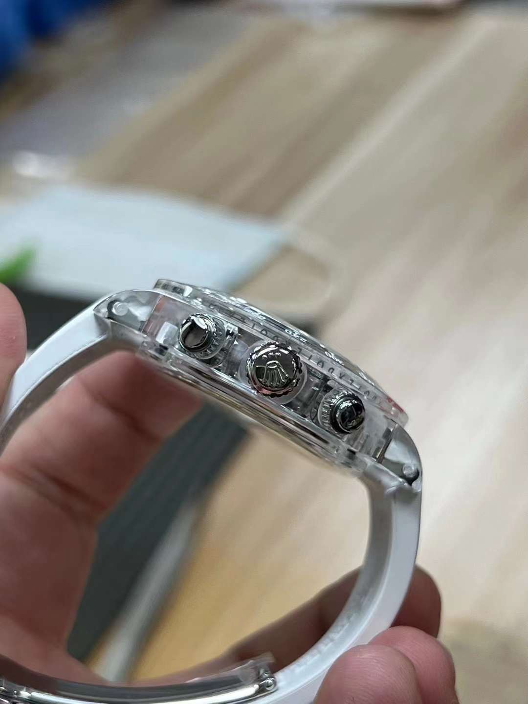 Màu sắc sử dụng tông trắng chủ đạo tạo cảm giác nhẹ nhàng cho người đeo. Bộ khung nhựa trong suốt hài hòa với dây đeo da cao cấp màu trắng ấn tượng. Tất cả chi tiết cấu thành tạo nên nét khác biệt cho Đồng Hồ Rolex Replica siêu cấp.