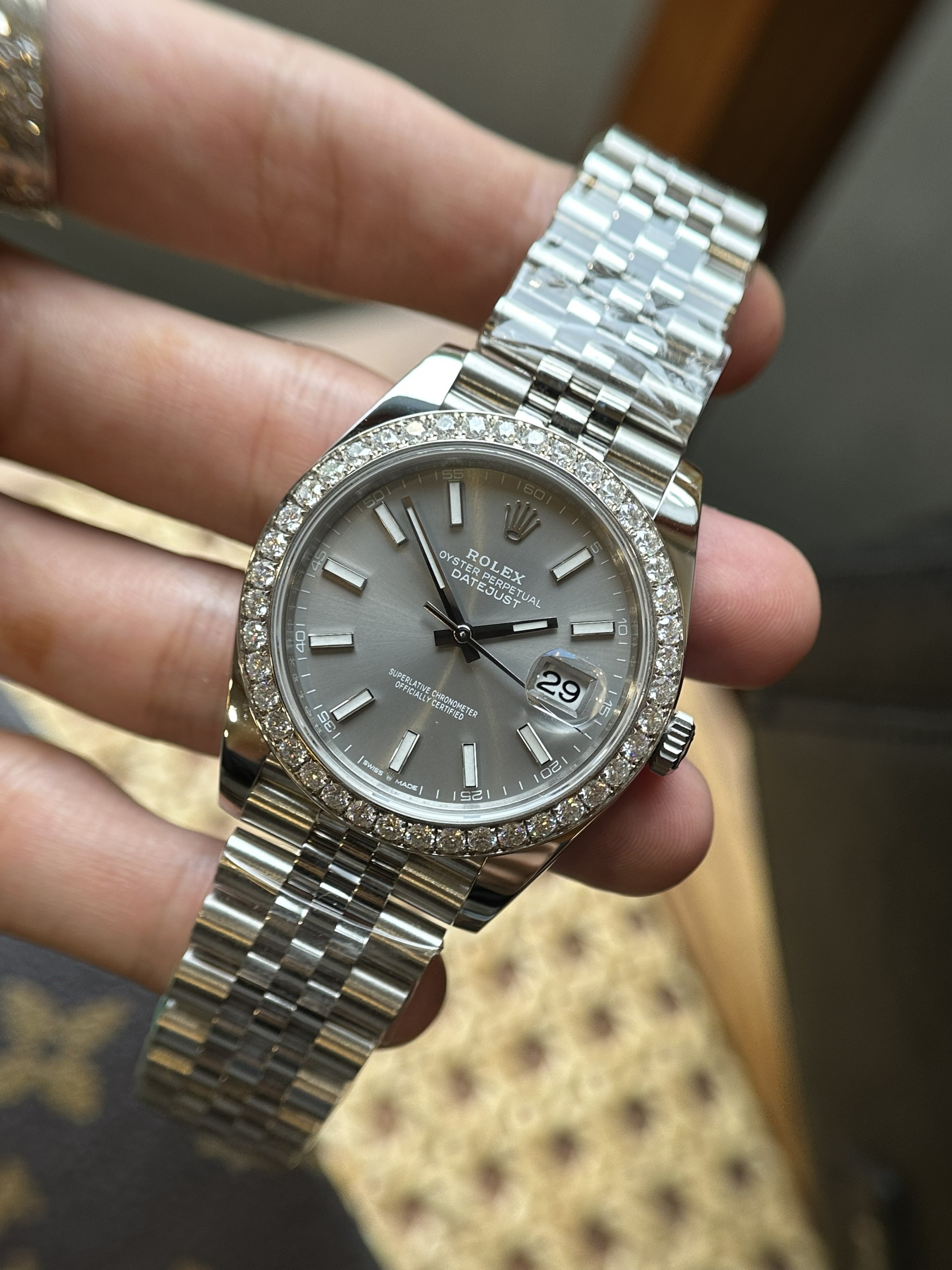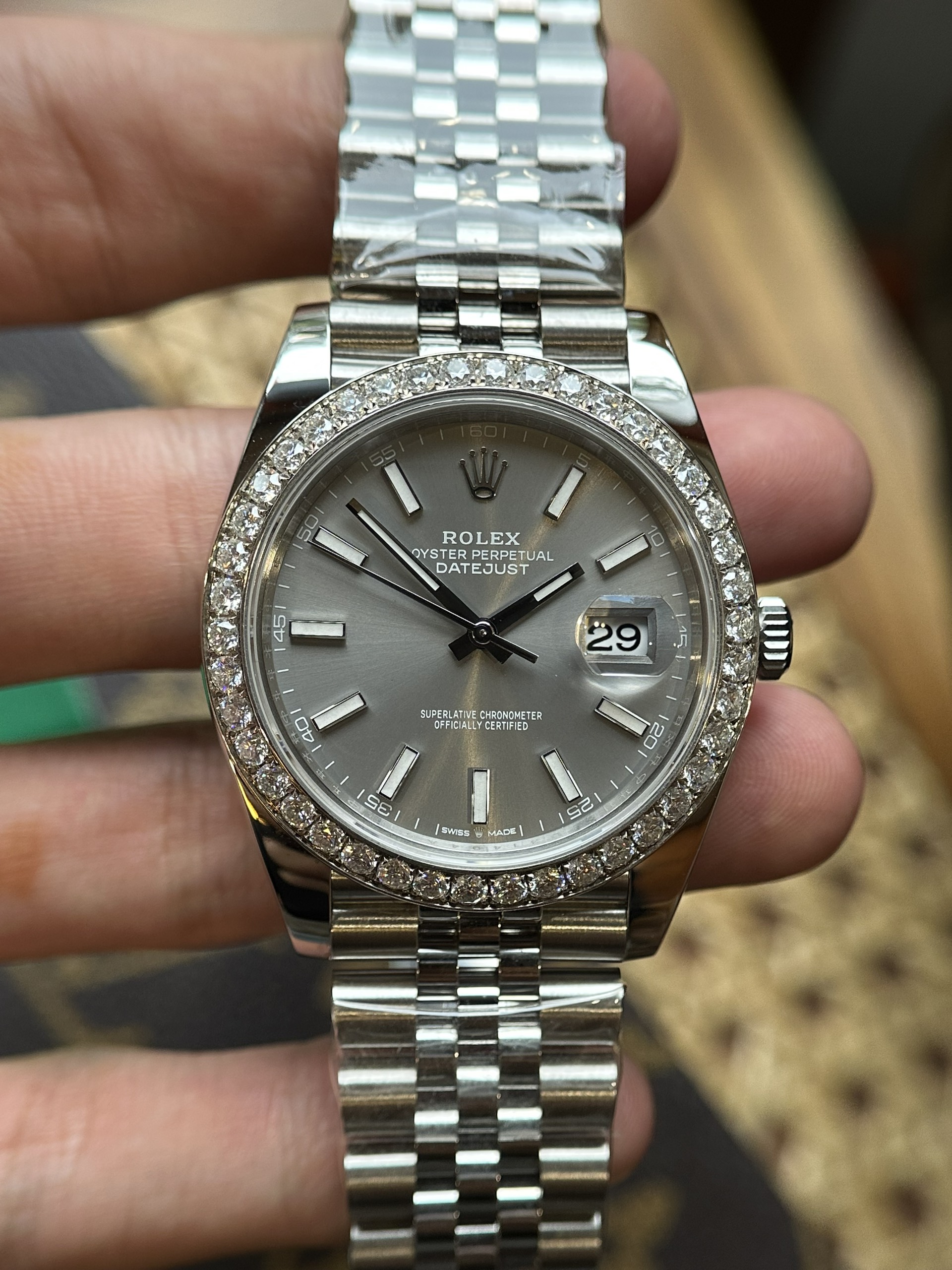 Chất liệu Đồng Hồ Rolex Datejust 126284 Mặt Số Gray Viền Đá Like Auth cao cấp