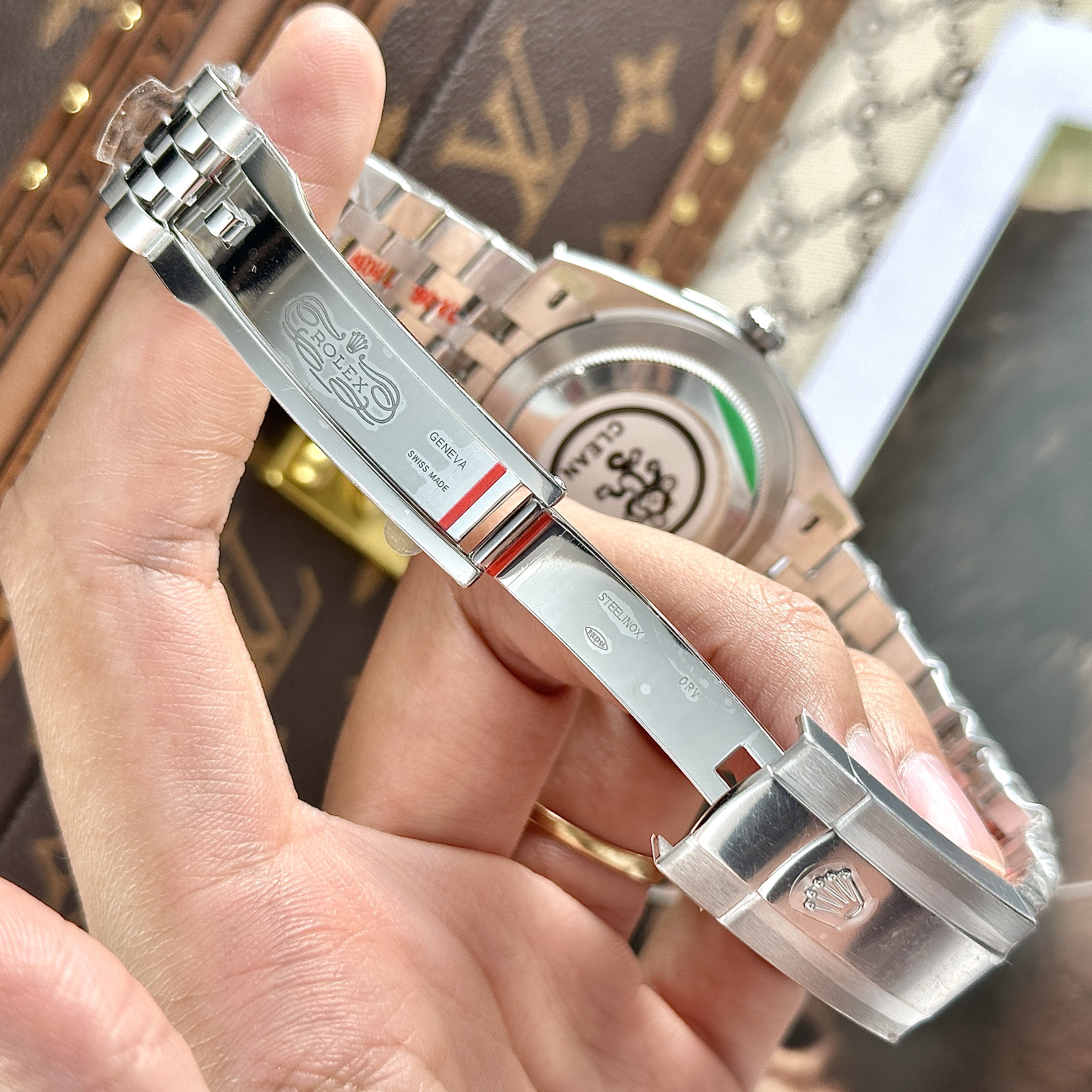 Góc 3h, ô cửa số báo ngày đặc trưng gắn tròng kính Cyclops bên trên giúp người đeo xem rõ hơn. Dây đeo Oyster vẻ đẹp đặc trưng kết hợp giữa kỹ thuật đánh bóng ở giữa và chải xước mờ ở 2 mối nối ngoài cùng càng. Nhờ vậy, cỗ máy tôn lên nét đẳng cấp.