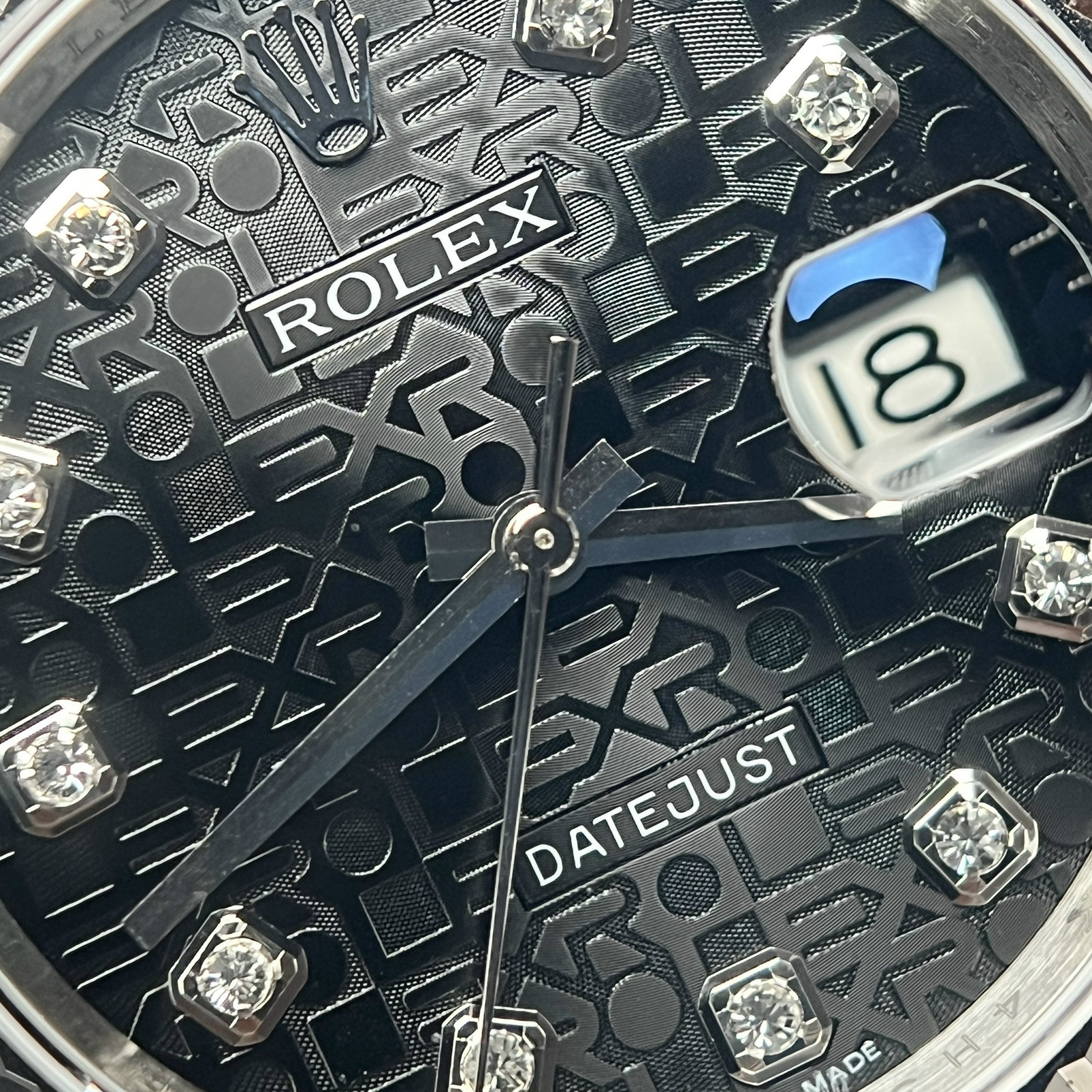 Nền mặt số Đồng Hồ Rolex Datejust Mặt Vi Tính Like Auth màu đen ấn tượng. Điểm chỉ giờ phủ lớp dạ quang phát sáng trong môi trường bóng tối. Ô cửa sổ hiển thị lịch ngày cập nhật chính xác dưới lớp kính có chức năng phóng đại. Lớp kính bảo vệ bằng đá saphire trong suốt chống lóa và chống xước hoàn hảo. Núm điều chỉnh được khía rãnh đều nhau giúp người đeo dễ cầm khi thực hiện.