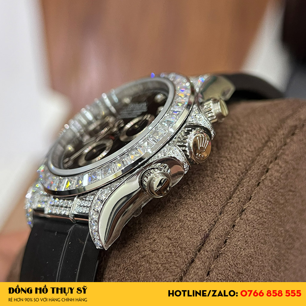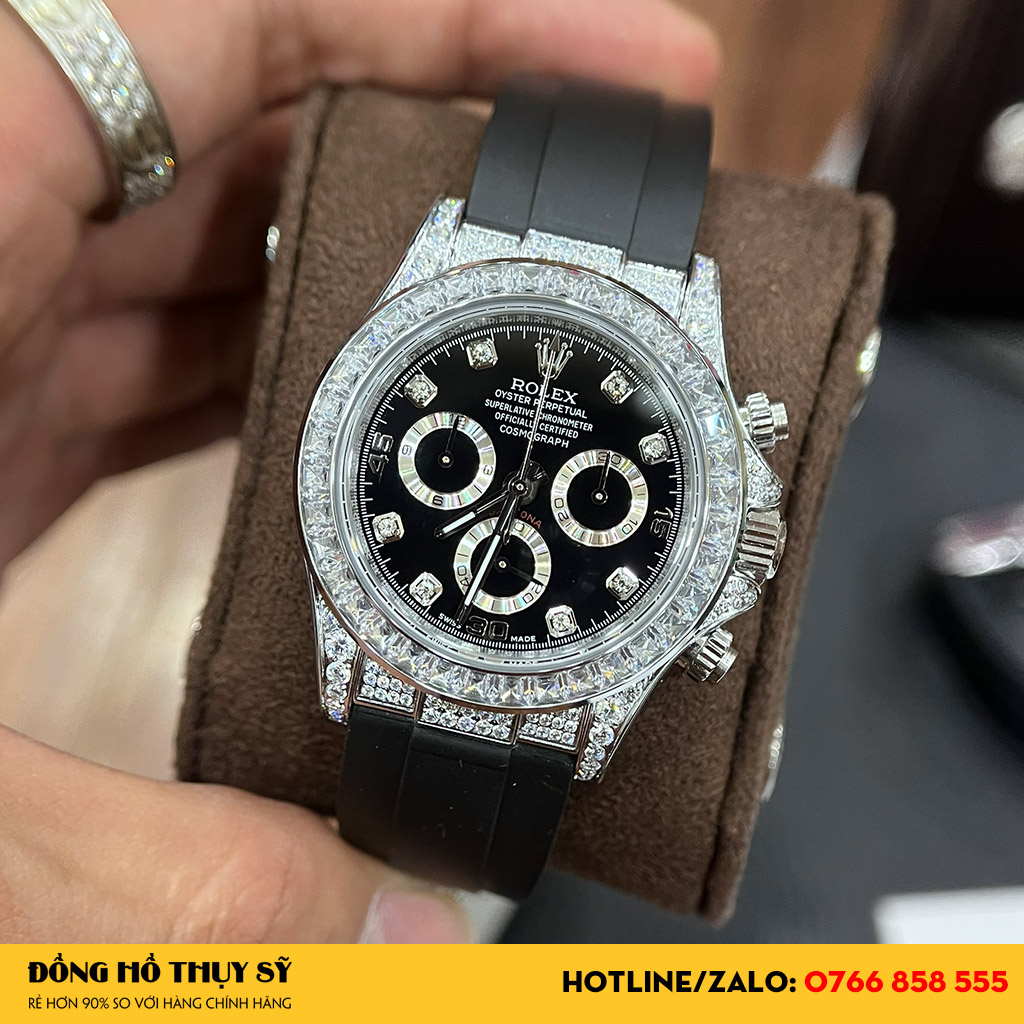 Dây đeo Đồng Hồ Rolex Daytona 116519 Mặt Số Đen Viền Full Đá Replica cao su độc đáo