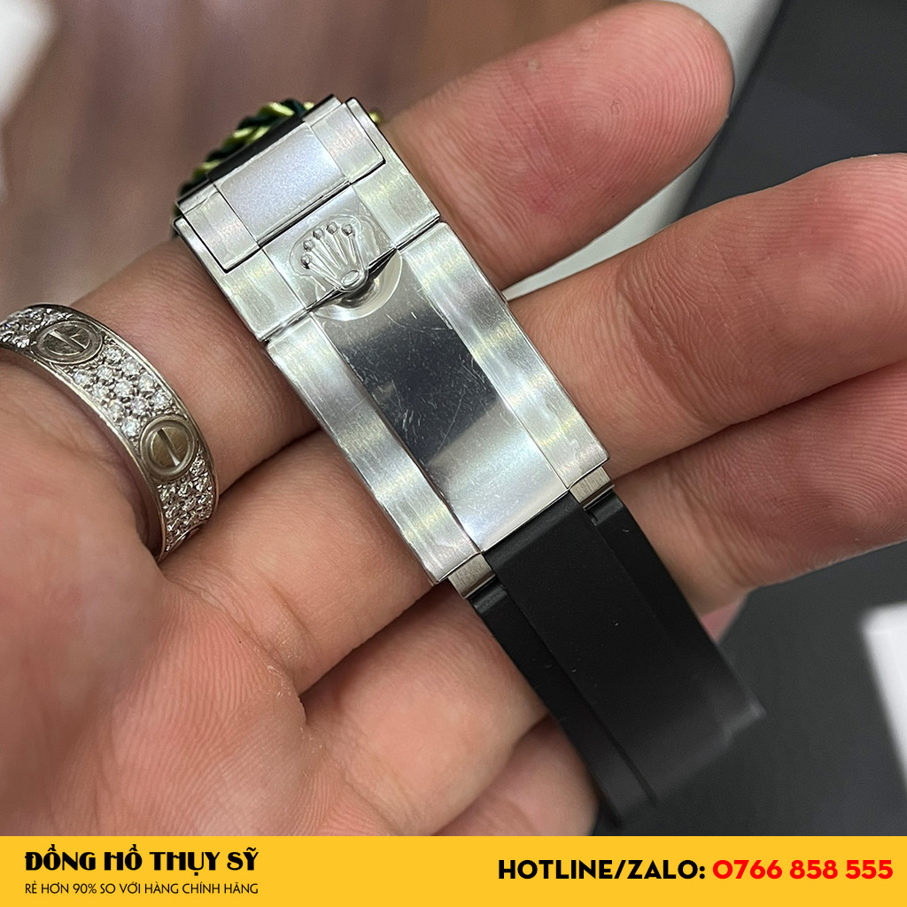 11 điểm chỉ giờ hình vuông nhỏ đính đá sáng trong nổi bật. Ở 12h, biểu tượng hìn vương miện đặc trưng là của thương hiệu Rolex. Bộ kim quay bản dẹt phủ dạ quang chạy êm mươt. Dây đeo bằng cao su thiên nhiên màu đen ôm sát cổ tay tạo cảm giác mềm mại.