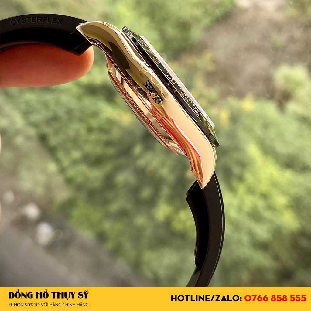 Khung vỏ thiết kế cá tính tạo điểm nhấn đầu tiên cho Đồng Hồ Rolex Replica. Chất liệu thép cao cấp phủ lớp mạ vàng Champagne sang trọng. Vành bezel bằng gốm ceramic độ bền tốt chia thành 2 tông màu: đen, xám sắc nét. Thang do Tachymeter khắc in rõ nét phù hợp người đeo muốn đo tốc độ di chuyển đến 400km/h.