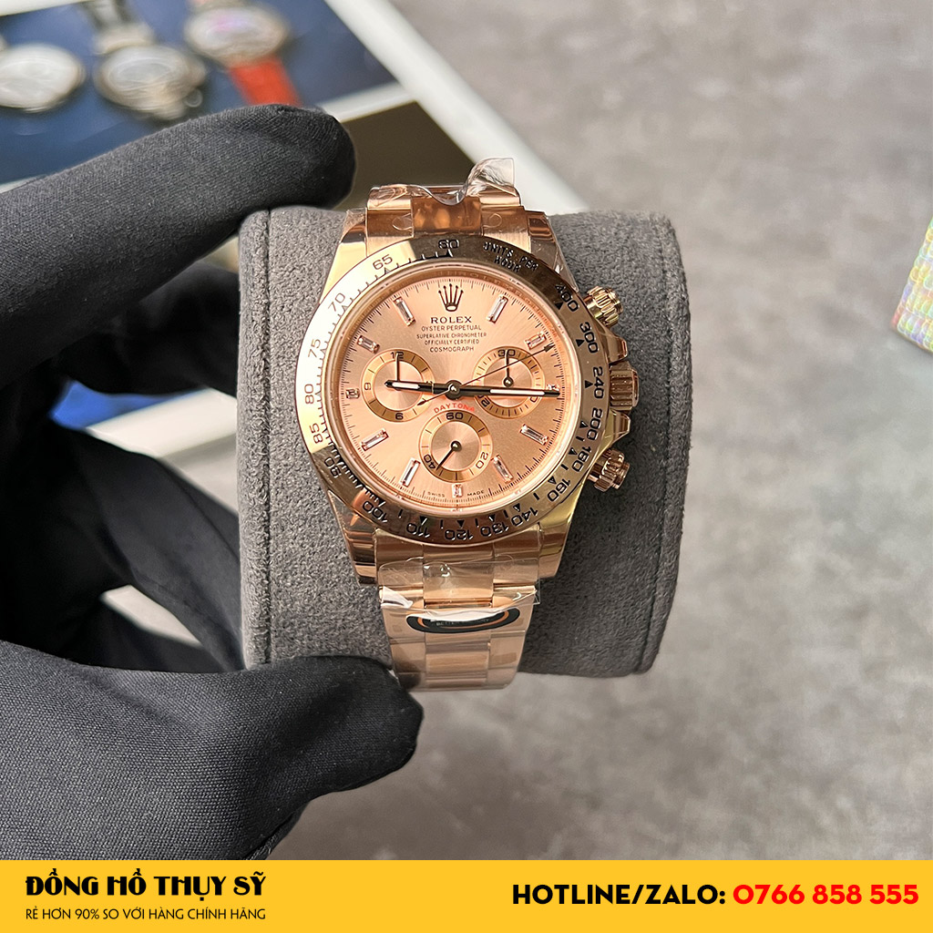 Đồng Hồ Rolex Super Fake 1:1 Cosmograph Daytona 116505 Mặt Số Hồng Cọc Số Kim Cương Baguette đang làm mưa làm gió trên thị trường. Tất cả chi tiết cấu thành hoàn chỉnh tạo điểm nhấn thu hút khách hàng. Đeo trên tay, bạn toát lên vẻ đẳng cấp riêng giúp nổi bật giữa đám đông.
