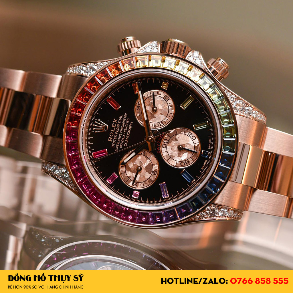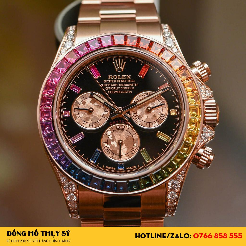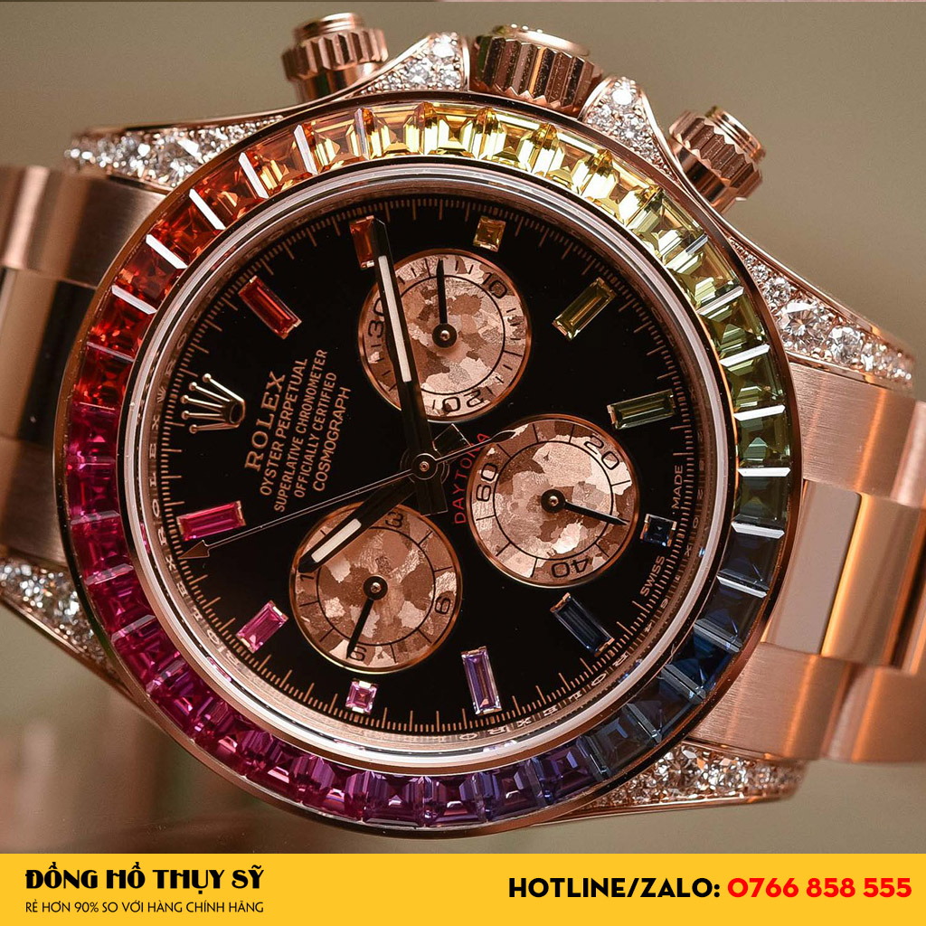Dây đeo Đồng Hồ Rolex Super Fake Daytona Rainbow Everose Gold 116595 dạng 3 mắt nối